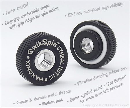 We've combined the best elements of metal wing-nut style cymbal nuts & cylindrical all-plastic cymbal nuts, while eliminating the drawbacks of both, THEN added several brand new advantages unique to the QwikSpin™.